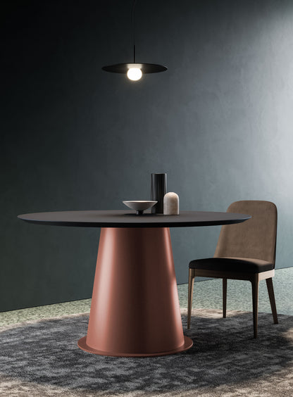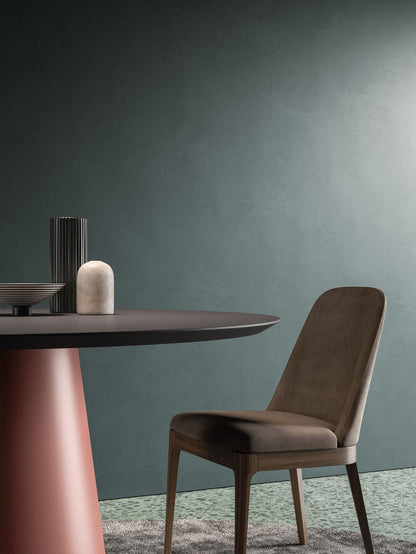 The wider scheme is styled with the Koni table (Tufo matt lacquer top, Copper metallic base), Tetris chair (fabric upholstery, Cotto-stained wood base) and Aster coffee tables (Tufo matt lacquer tops, Copper metallic bases) for a cohesive, modern aesthetic. Dining table and chairs are shown for styling reference and are not included in the unit price.