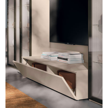 Presented here in oxidised wood and Tortora melamine finishes, the Day 24 design showcases how the Light System can adapt to different interiors. With the ability to add or remove cabinets, drawers, and open shelving, you can create a bespoke media and bookcase unit that perfectly fits your living space. This modular approach allows you to blend wood tones, melamine colours, and decorative glass to achieve your desired style, from contemporary minimalism to warm, textured interiors.