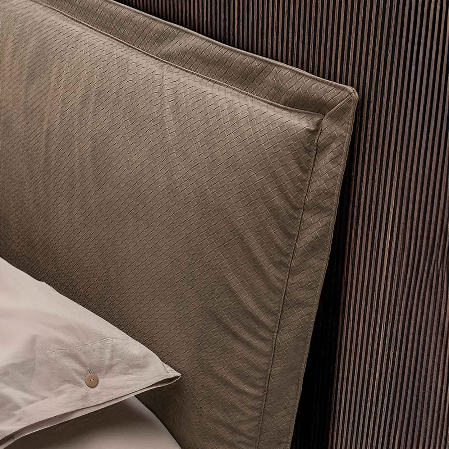 Morgan, your cosy retreat for sweet dreams. This double bed features a plush upholstered headboard, customizable with fabric, eco-leather, or leather from Dallagnese's wide selection. Its headboard resembles a comfy cushion, accentuated with visible stitching. Discover comfort and style with Morgan!