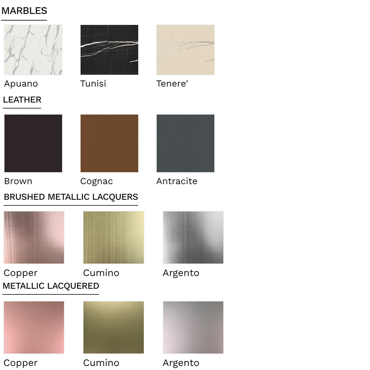 A wide range of matt lacquers, melamine, veneer, marble, and more.