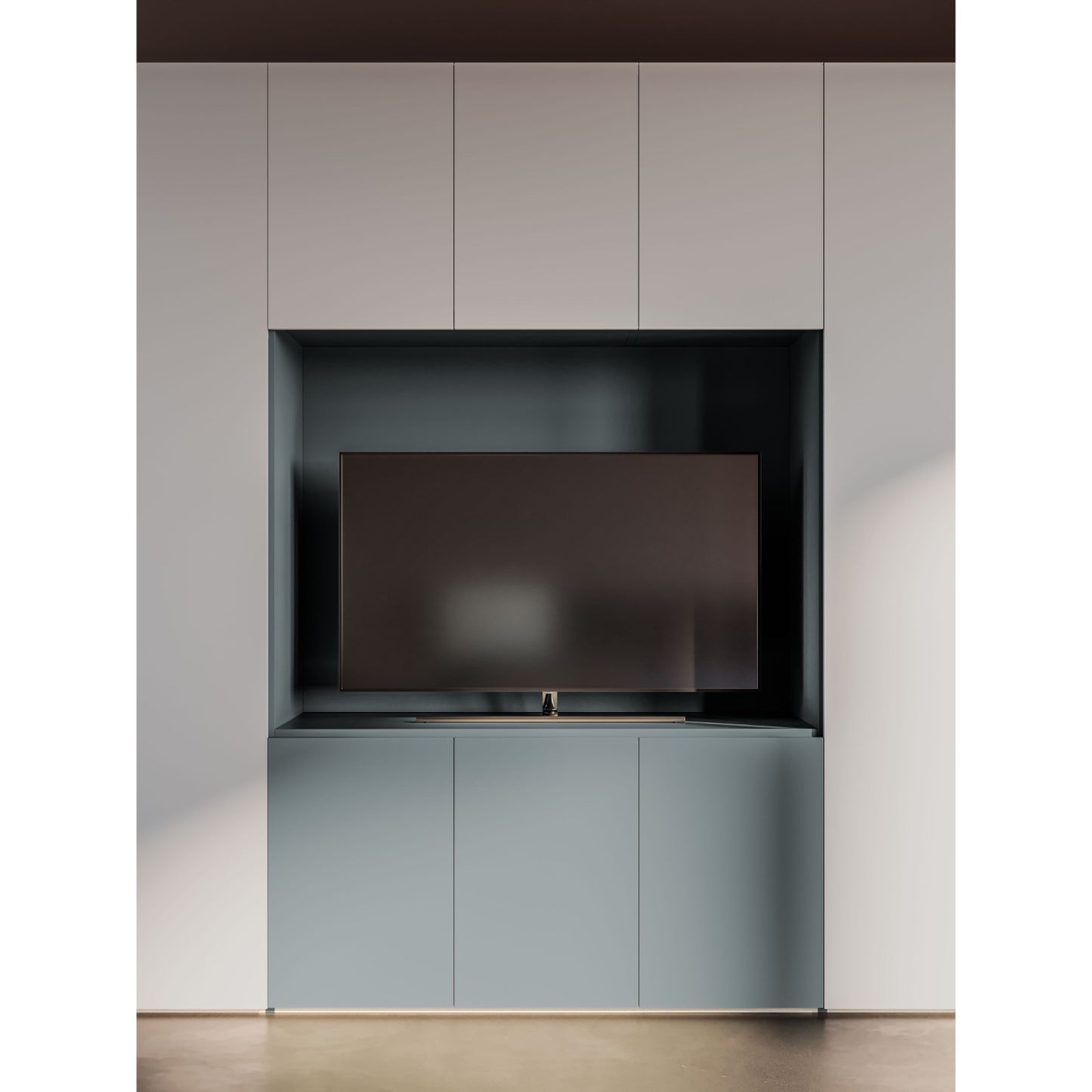 • Finishes shown: Cotone interior; Piuma lacquer doors; TV in Nebbia lacquer; L17 burnished metal handle