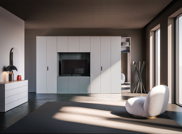 Designed for modern living, this wardrobe integrates a TV compartment finished in Nebbia matt lacquer, creating a dedicated entertainment space without sacrificing storage. A bridge section above the TV enhances capacity, perfect for seasonal items or bedding. The Piuma matt lacquer doors complete the calming aesthetic, making Night 07 both practical and stylish.