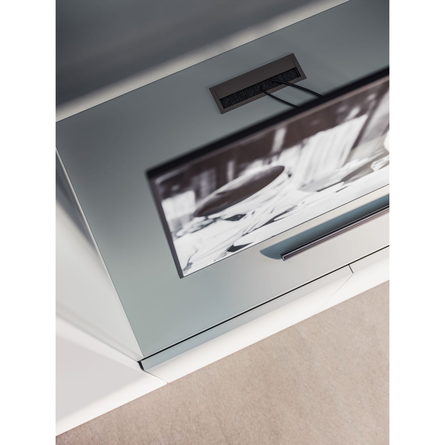 • Integrated TV unit with Nebbia lacquer bridge.