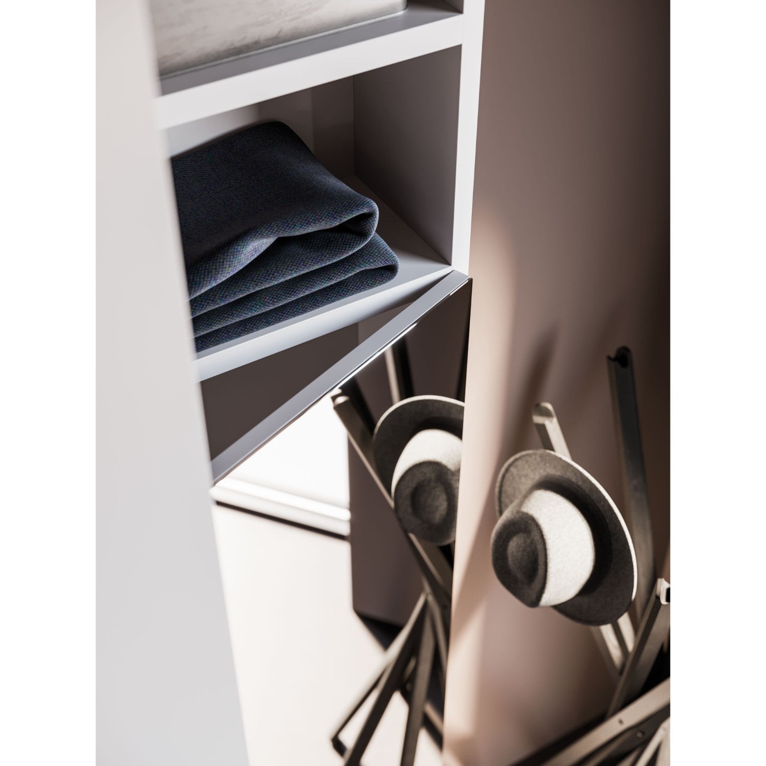 Smart, functional, and contemporary. The Night 07 hinged wardrobe by Orme Design combines sleek Liscia doors with elegant L17 burnished metal handles for a minimalist yet refined look. The interior, finished in light Cotone, provides a clean and neutral backdrop with spacious compartments for organised storage.