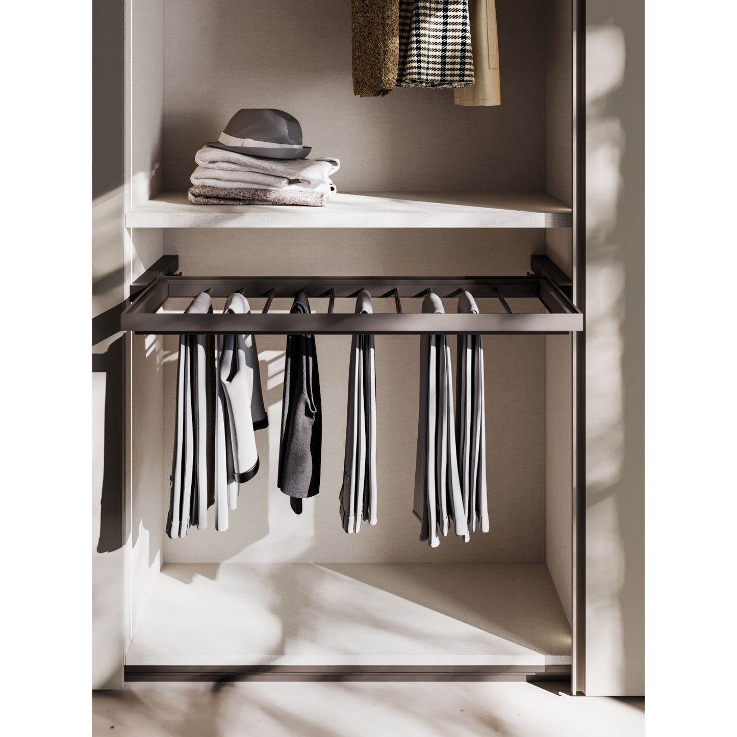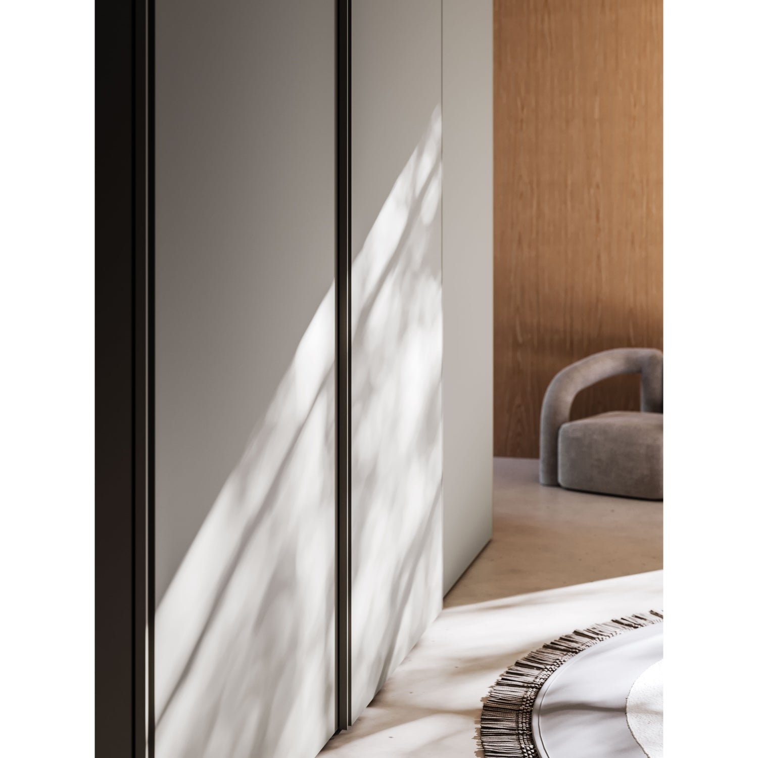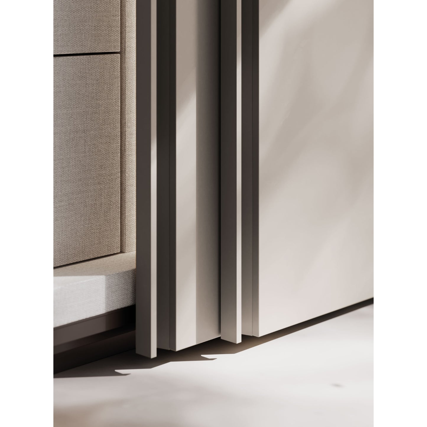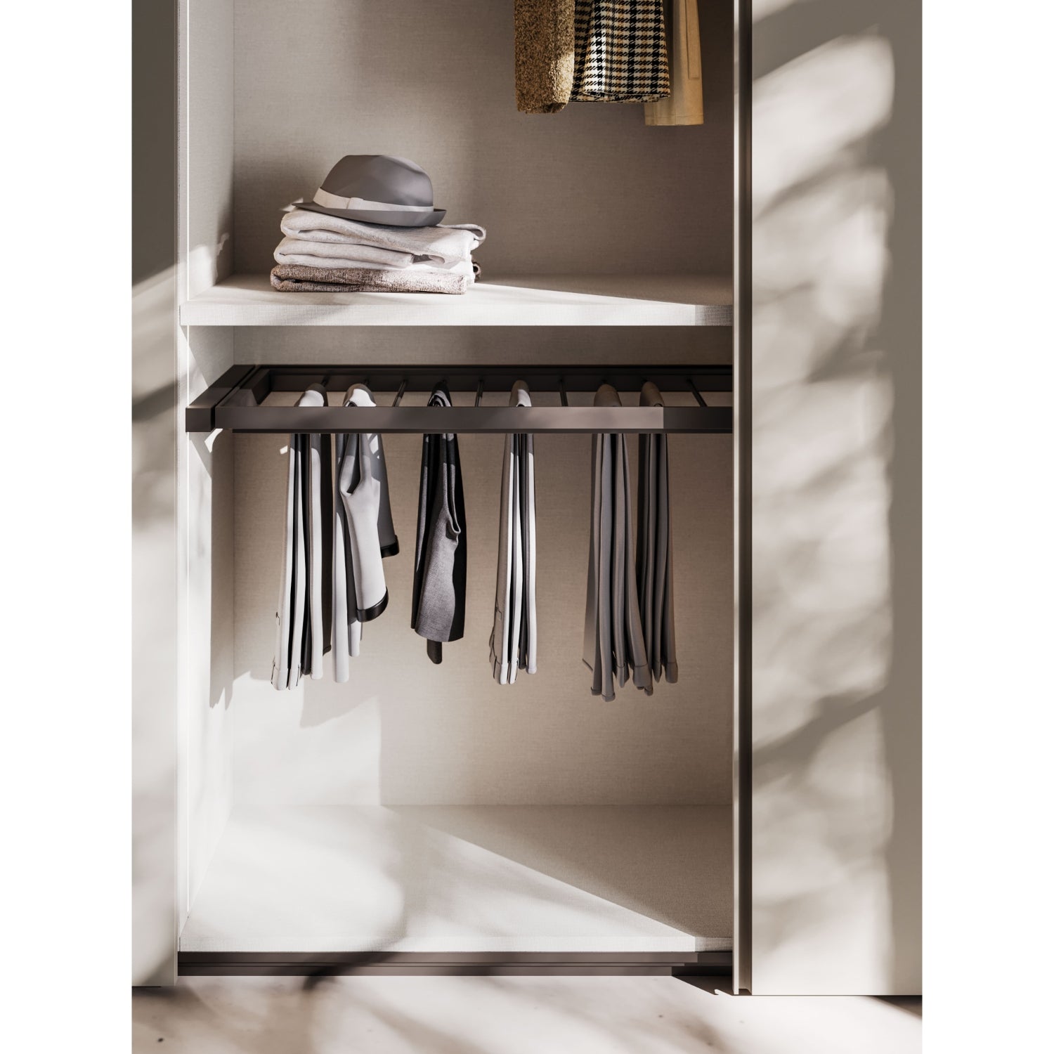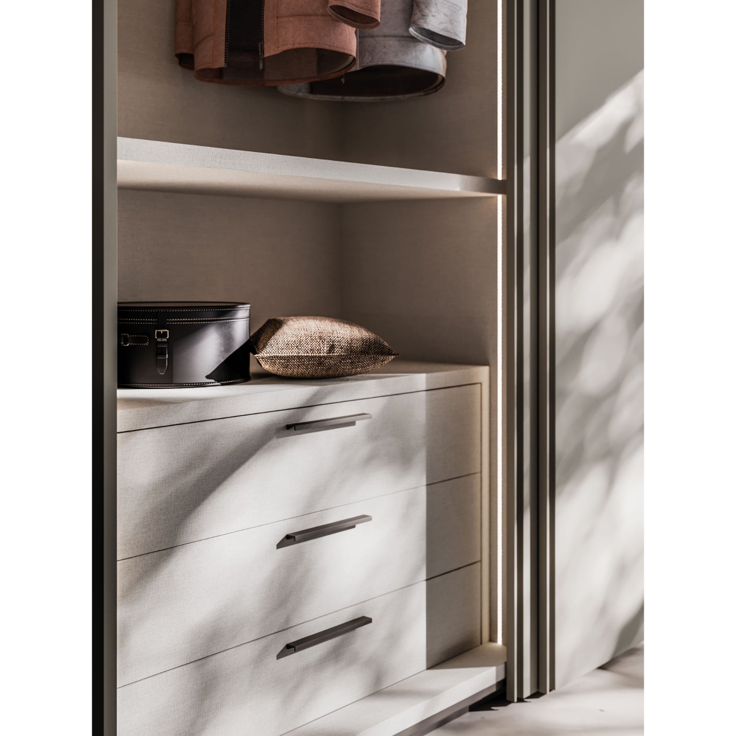 The interior is finished in a warm Cotton tone, adding a natural, balanced elegance to the storage space. This finish creates a soft backdrop for clothing and accessories, blending durability with refined texture. On the exterior, Titanio matt lacquer doors and Gola handles give the wardrobe a striking titanium tone, providing contrast against the Cotton interior. This durable finish is resistant to fingerprints and scratches, ensuring long-lasting sophistication.
