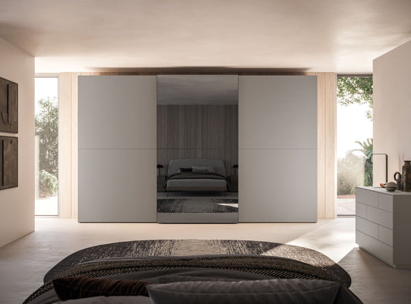 Modern elegance with practical design. The Night 29 sliding wardrobe combines sleek Vista mirrored doors with refined Arka panel doors for a sophisticated, contemporary look. Italian-designed, it enhances light reflection while providing ample storage space to keep bedrooms clutter-free. The sliding door system ensures smooth operation, while customisable interiors allow soft-close drawers, adjustable shelves, and hanging rails tailored to your needs.