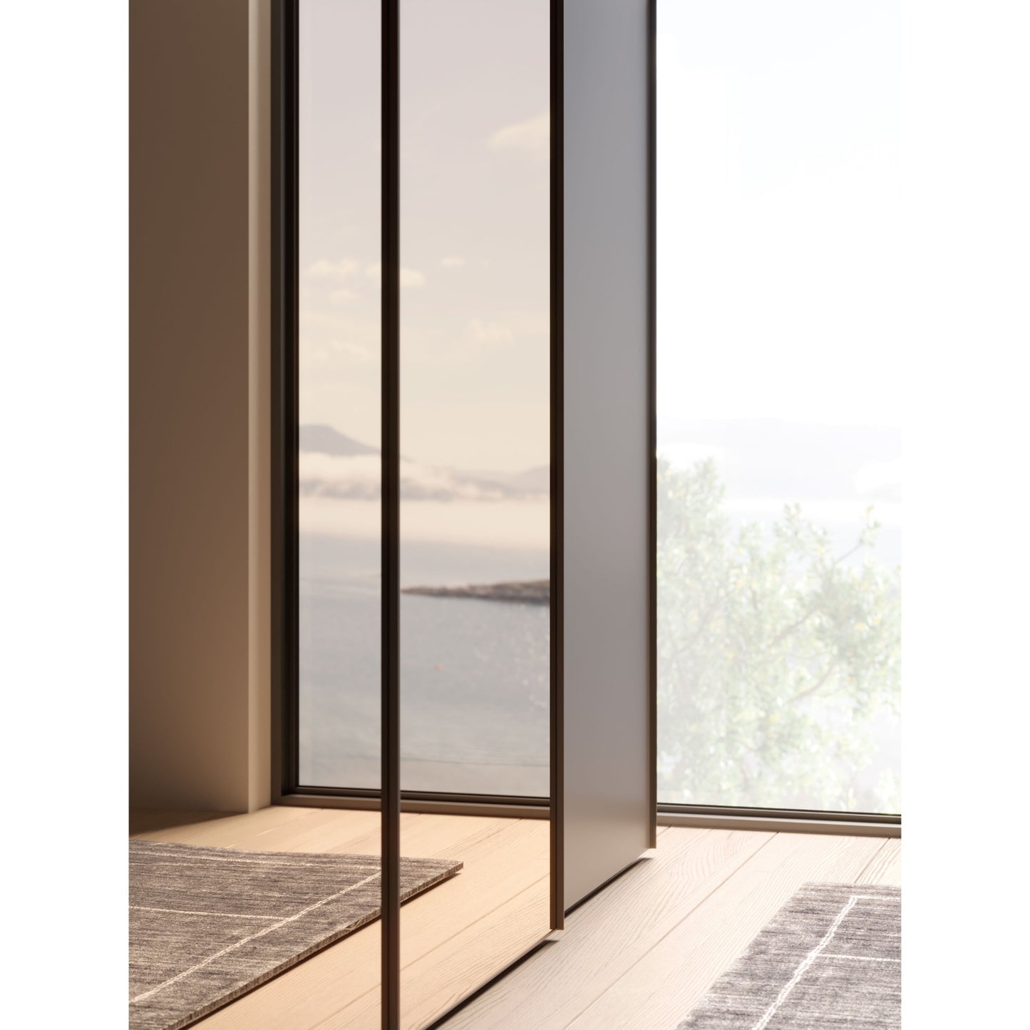 Mirrored + frame doors, Argilla lacquer, bronzed glass, and Cotone interior for a light, modern look. -