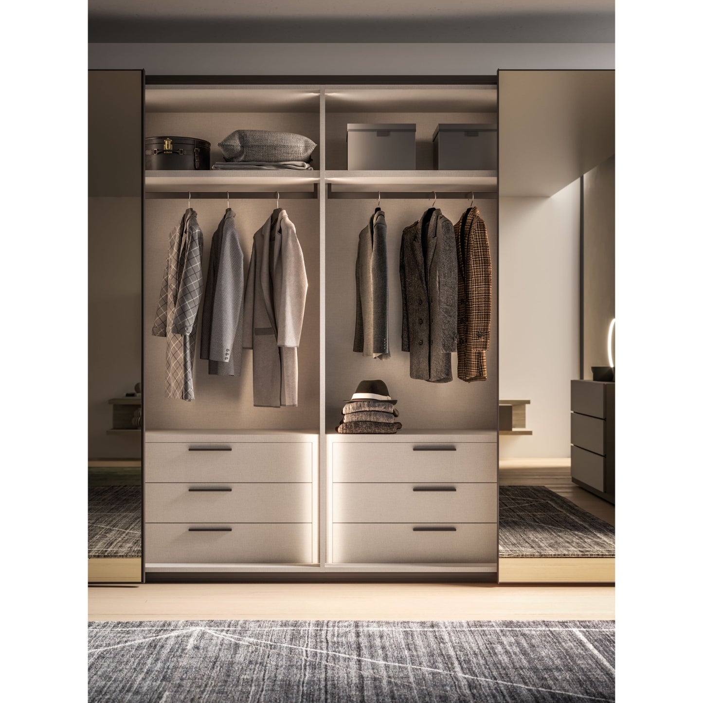 The internal structure features a luxurious Cotone texture that feels warm and sophisticated. A thoughtfully arranged interior maximises capacity with hanging space, shelves, and compartments for everyday organisation. The Cotone tone complements external Argilla matt lacquer and bronzed glass, creating a harmonious inside-out balance for both function and style.