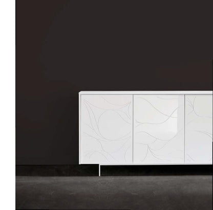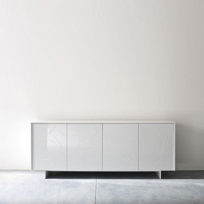 Introducing 'Onda' is a symbol of minimalism that effortlessly defines the aesthetic of any space. This sideboard features four intricately engraved doors, showcasing a captivating wave design. Behind these doors, discover tempered glass shelves that add both sophistication and functionality.