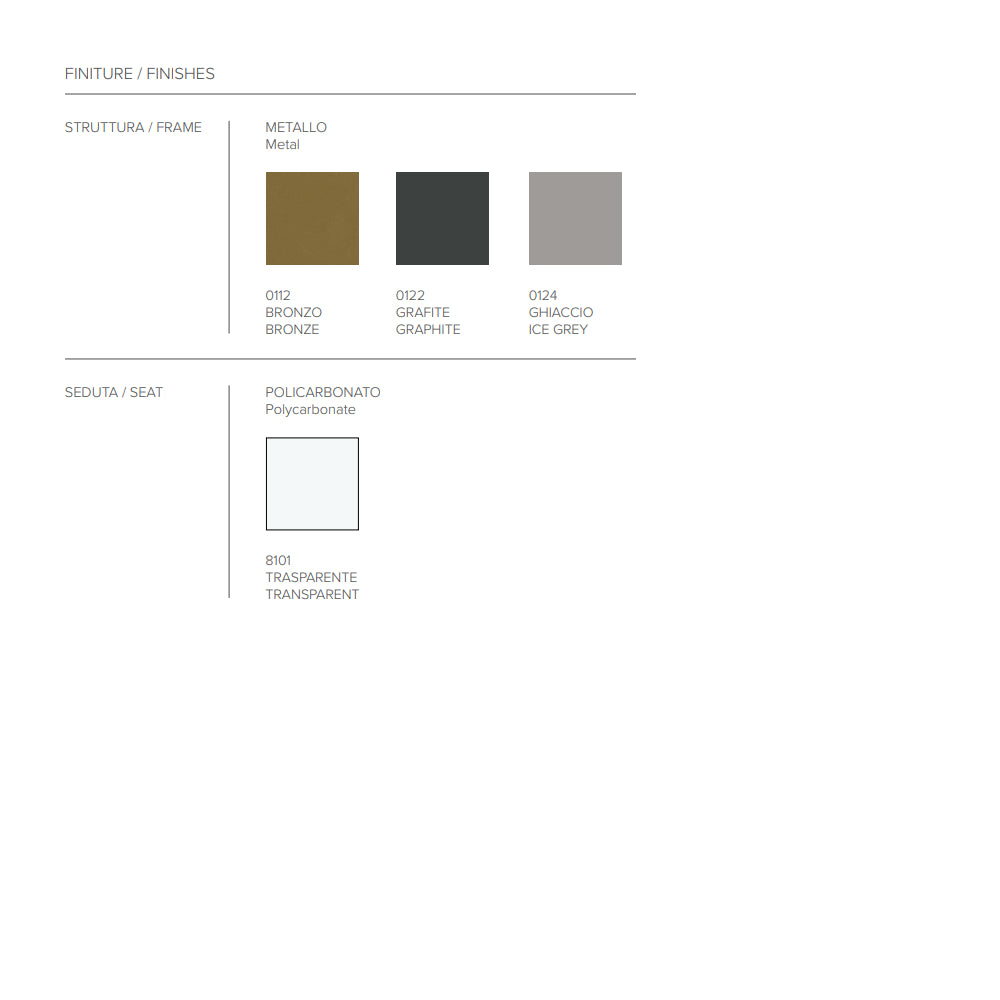 Crafted with a sturdy painted metal structure, the PANAMA chair promises durability and stability, ensuring it can withstand daily use while maintaining its pristine appearance. The transparent polycarbonate seat not only adds to its modern appeal but also provides comfort and support. The choice of materials reflects a commitment to quality and innovation, ensuring the chair's longevity and timeless appeal.
