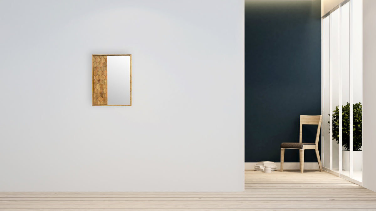 Enhance your collection with our exquisite mirror cabinet, meticulously crafted from 100% solid mango wood, adorned with an Oak-ish finish, and showcasing a charming pineapple carving on its front panel. This cabinet boasts a convenient sliding mirror and discreet interior shelves, making it ideal for storing various items in your bathroom or hallway. Whether standing alone or harmoniously paired with other pieces from the same range, this mirror cabinet is the ultimate home accessory, adding both functionality and style to your space.