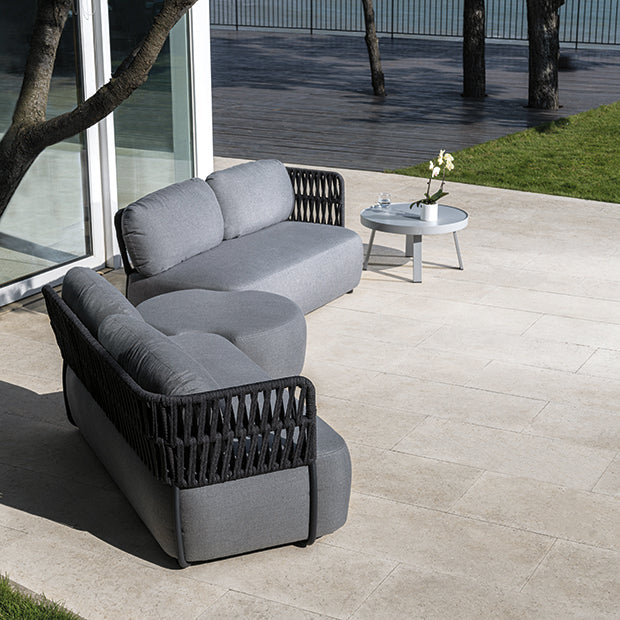 - Aluminium set covered with polyolefin rope, composed by two sofa 2 seaters, one corner and an aluminium top coffee tables, olefin fabric and water resistant foam