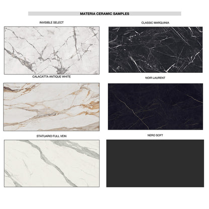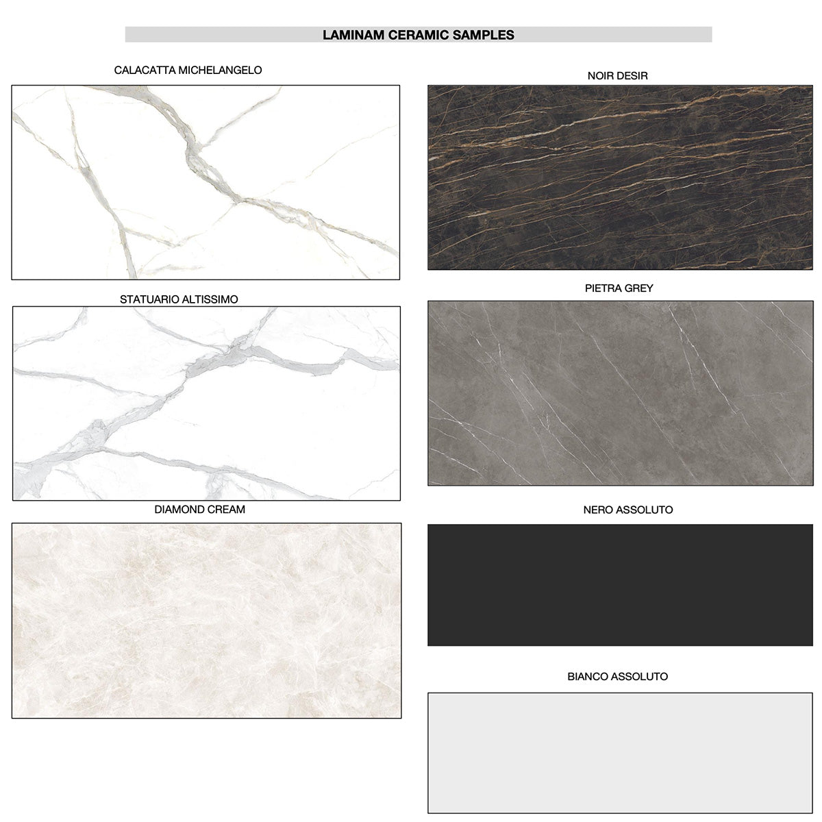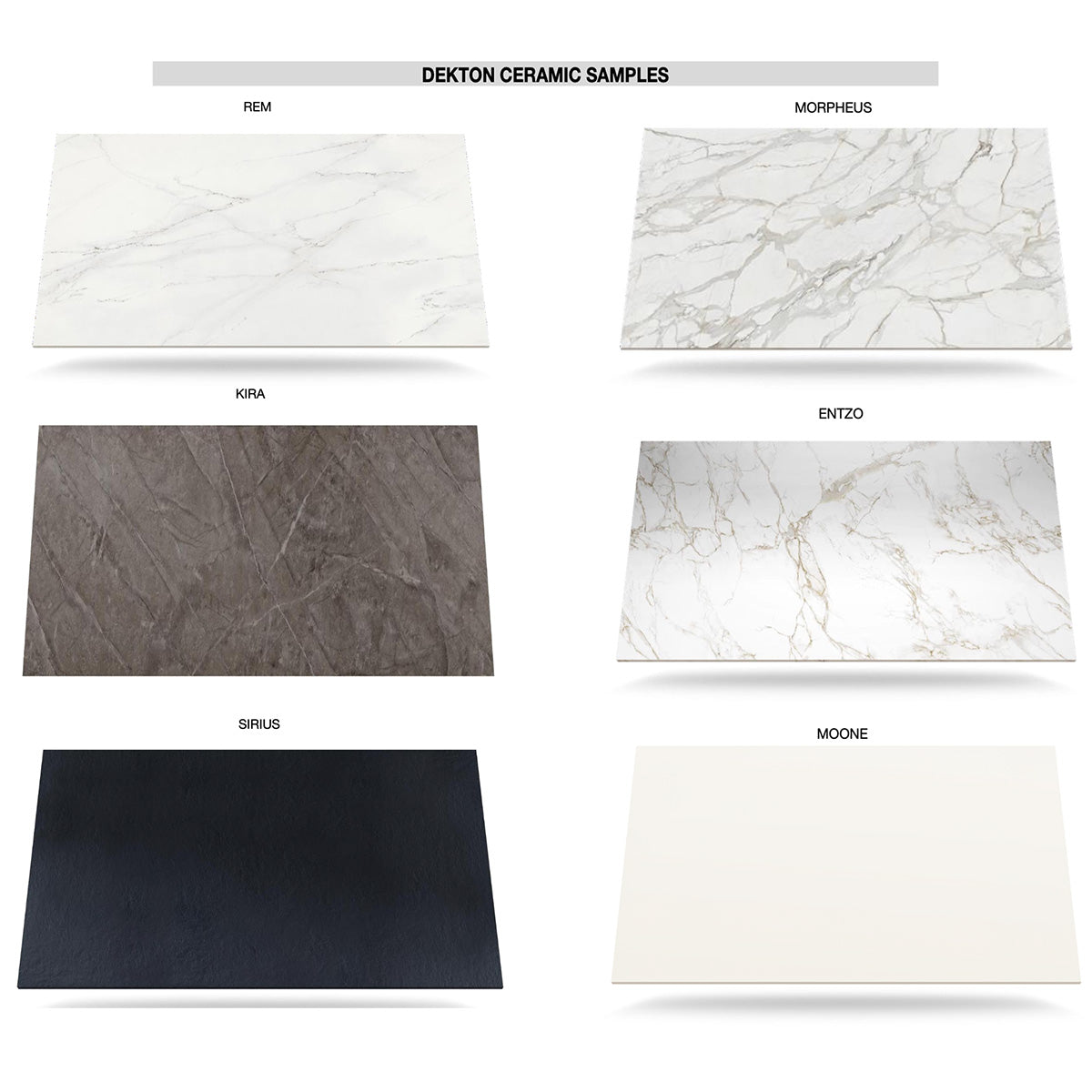- Ceramic (20 mm) – High-performance surfaces by Dekton, Laminam or Materia; heat, UV, scratch and frost resistant, suitable for indoor or outdoor use.