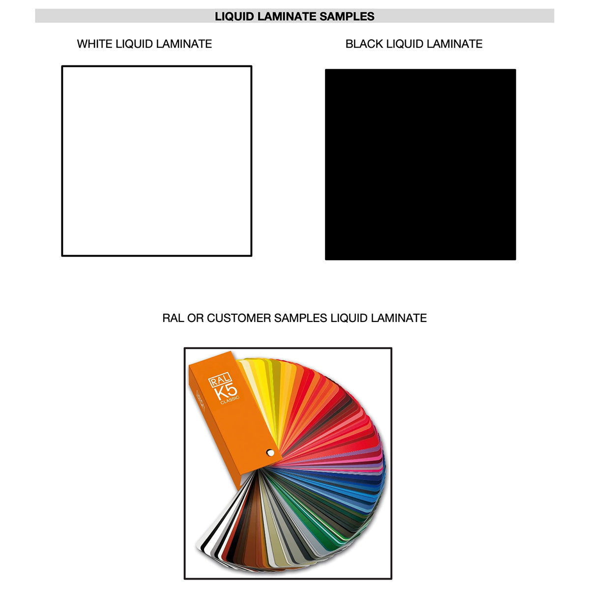 - Liquid Laminate (25 mm) – Lacquered MDF in white, black, or any RAL colour. Semi-opaque, scratch-resistant surface with reduced liquid absorption.
