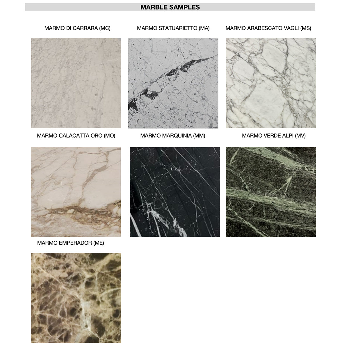 - Polyester Marble (20 mm) – Marble sealed with a transparent polyester varnish for a smooth, uniform touch and added resistance to liquid absorption.