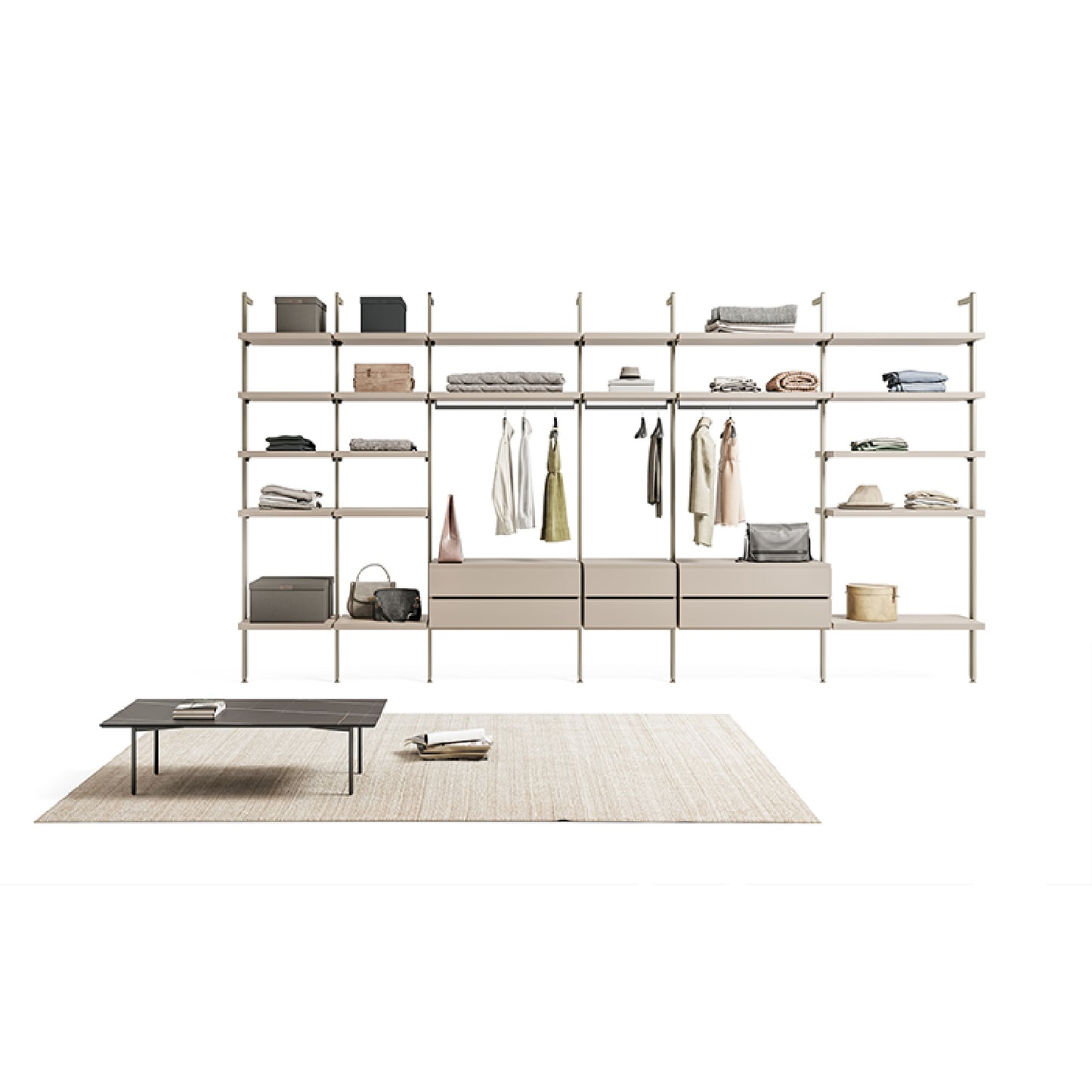 Guide Prices:To provide an estimate of the price range for the Dall'Agnese Bamboo wardrobe, we've calculated the cost for the configuration with 4 flor to ceiling racks, 3 drawers, 3 coat hangers and 6 shelves with a total length of 2701mm and max height 2900mm in a bronze glass finish. Please note that this price covers the standard setup. The Emotion-up collection by Dall'Agnese can be customised to your specific needs and specifications.