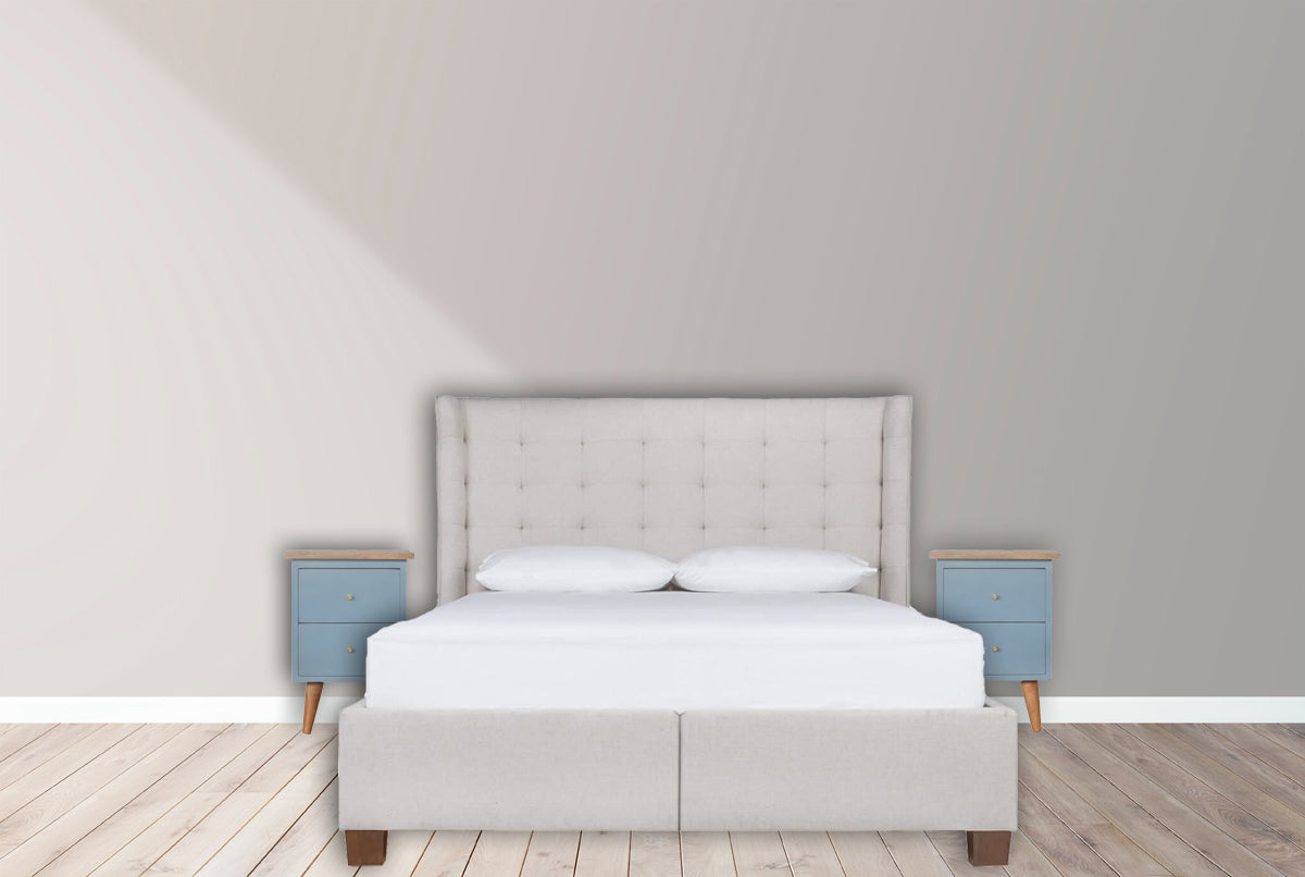 This exquisite bedside cabinet is crafted entirely from 100% solid mango wood, showcasing a stunning oak-ish finish on its top and legs. The body of the bedside is adorned with a skillfully hand-painted blue coat, and it boasts two drawers with shiny knobs for effortless accessibility. Adding this bedside to your bedroom is sure to add a touch of sophistication and charm.