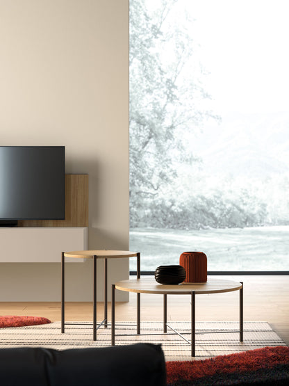 The Modulo wall unit features a Sabbia matt lacquered drawer with Rovere textured back panels, enhanced by graphic elements in Cumino metallic lacquer for a refined touch. Suspended bases in Sabbia matt lacquer contrast elegantly with Oak textured panels, highlighting the interplay of materials. Iris coffee tables with burnished metal frames and Oak tops add depth and versatility, while additional Modulo units in Caramello matt lacquer complete this harmonious Italian design.
