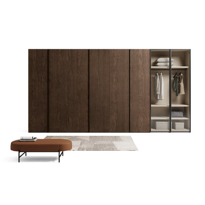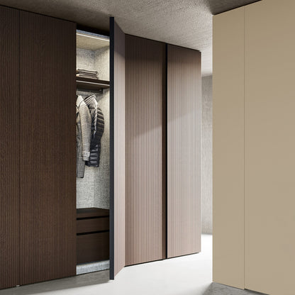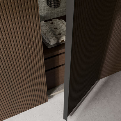 With a sophisticated interplay of light and shadow, interrupted only by the full-height metal profile that serves as an elegant handle, the Ritmo wardrobe is a statement of strict linearity and refinement in interior design. It is ideal for enhancing a room and drawing attention to itself. What sets Ritmo apart is its cannete texture, which imparts an extraordinary aesthetic rhythm to the wardrobe. This sophisticated texture creates an interplay of light and shadow that brings the wardrobe to life. Every detail has been meticulously designed to craft a visual experience that is impossible to ignore.