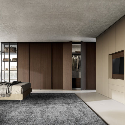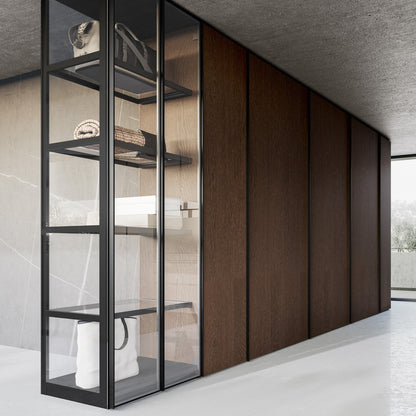 In order to achieve an exceptional and well-coordinated design, the Ritmo wardrobe can be paired with the Scena or Glass All walk-in closet, resulting in unique style combinations for a flawless and practical aesthetic. In this image, the Ritmo door features a heat-treated oak cannete decoration, which is complemented by the Glass All door with a black frame and grey transparent glass.