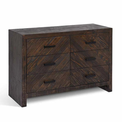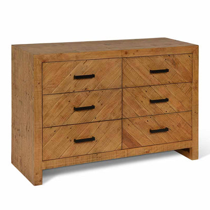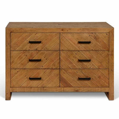 Elevate the ambience of your bedroom into a refined haven for restful nights with our Fawley Chevron Chest of Drawers. Immerse yourself in the sophistication of this eye-catching furniture piece, which shares its distinctive design with the coordinating bed and bedside tables. Meticulously crafted from reclaimed pine, the Fawley Chevron Chest of Drawers not only adds a touch of elegance to your sleeping space but also embodies sustainable and eco-friendly principles. Experience the seamless integration of style and substance as you transform your bedroom into a sanctuary of comfort and chic aesthetics with this exquisite furniture collection.