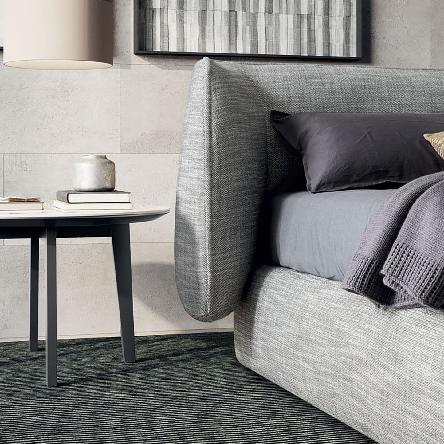 - BED FRAME: Internal structure made of CARB-2 certified wood particle-board panels, padded with polyurethane foam and upholstered with bonded fabric. Cylindrical feet dia. 70 mm made of anthracite-coloured plastic. Bed frame supplied with central crosspiece and support foot and is also fitted to accommodate two separate bed slats.