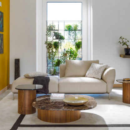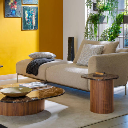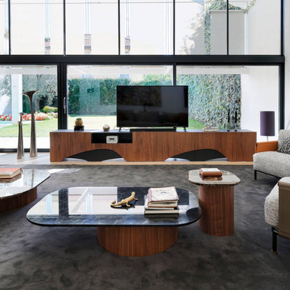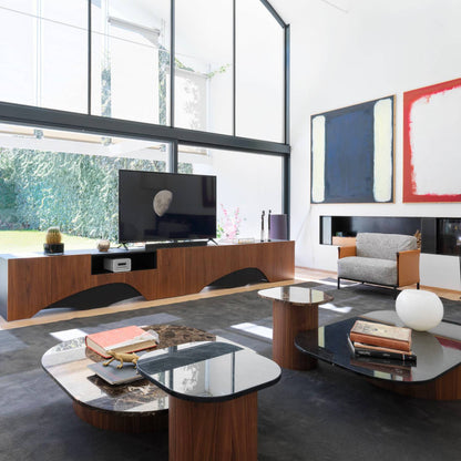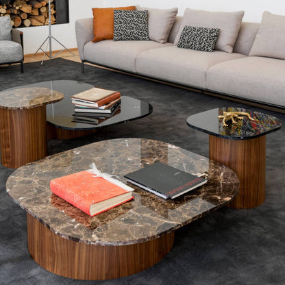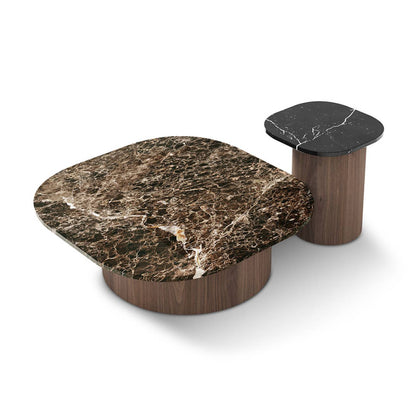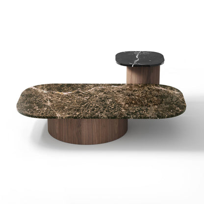 Crafted with precision, the Marina collection distills the traditional table into its essential form, stripping away unnecessary design elements to achieve elegance through simplicity. The use of natural materials—rich walnut and luxurious marble—creates a warm and sophisticated aesthetic that effortlessly enhances any interior. Each table is a testament to the art of synthesis, where wood and marble come together to form evocative and functional shapes.