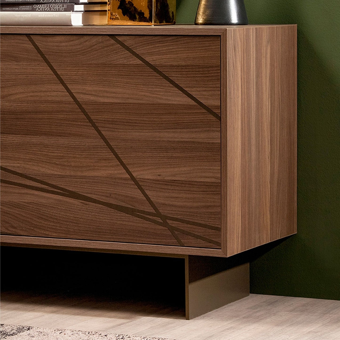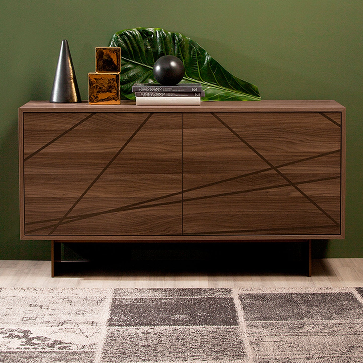 Supported by a robust bronze stone varnished metal base, the two or three-door sideboard stands as a testament to timeless design and enduring quality. A true must-have for those seeking to elevate their living space. The crisscross linear design, a hallmark of contemporary aesthetics, adds a touch of modernity to the classic wood frame.