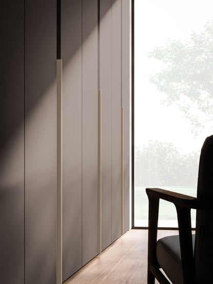 A standout detail is the Palladio metal lacquer handle, ergonomically designed with a subtle metallic sheen that contrasts beautifully with the Terra finish. This combination of Terra, Cotone, and Palladio results in a harmonious blend of tones and textures, creating a wardrobe that is both practical and luxurious.
