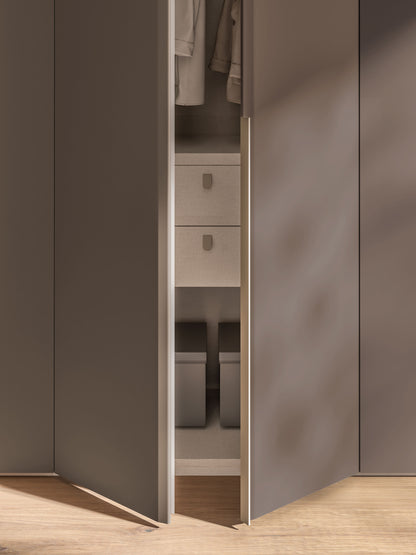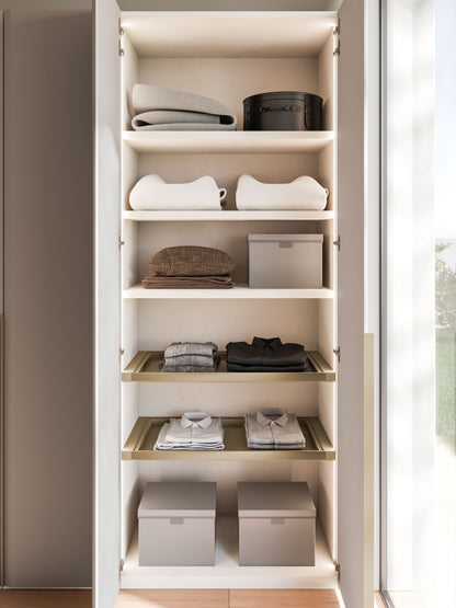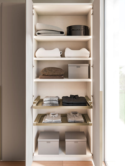 The internal structure is finished in Cotone, a neutral, textile-inspired tone that balances durability with refined aesthetics. Adjustable shelves, rails, and compartments allow for versatile organisation of clothing and accessories, ensuring functionality without sacrificing design appeal.