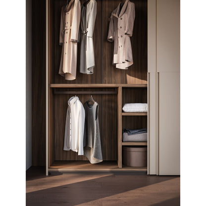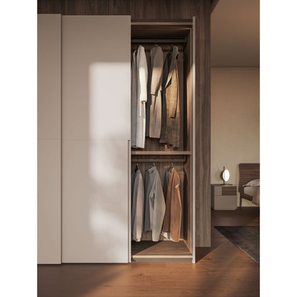 The internal structure is finished in warm Cotton, a natural tone that adds durability and understated sophistication. Inside, thoughtfully arranged shelving and rails maximise storage space, ensuring clutter-free organisation with a stylish touch. Compact yet versatile, this wardrobe is designed to enhance both functionality and design in any bedroom.