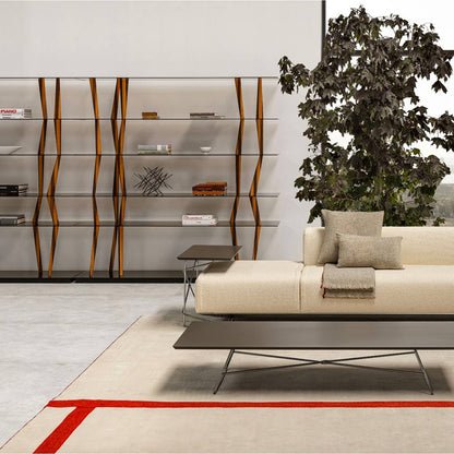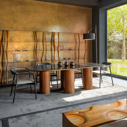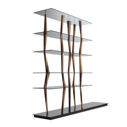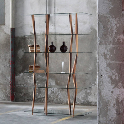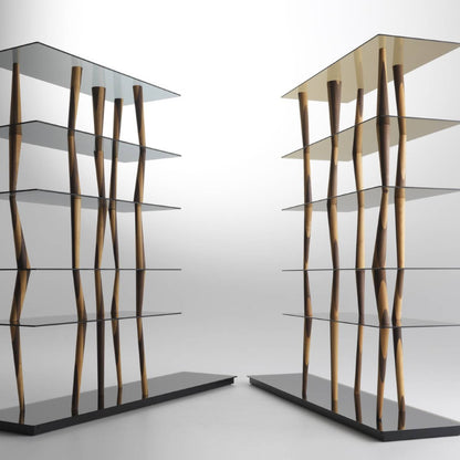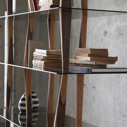 Comprising six glass shelves, the Sendai Crystal is connected by uniquely turned solid wood elements, each varying in inclination and section. This intricate construction creates a sense of fluidity and rhythm, making- it as much a work of art as it is a practical storage solution. The thoughtful interplay of materials—transparent glass and warm wood—enhances its timeless and elegant appeal.