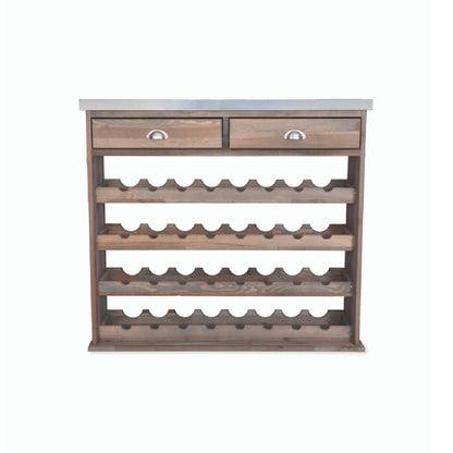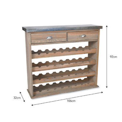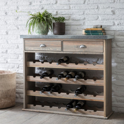 Created to merge style with practicality, the Aldsworth Wine Store embodies a fusion of classic craftsmanship and contemporary functionality. Its European Spruce construction speaks of durability and refinement, while the incorporation of galvanised sheet metal on the top surface adds a modern edge to its overall aesthetic. The thoughtful inclusion of two upper drawers expands its utility, enabling users to effortlessly organise dining or kitchen accessories alongside their wine collection. This store's innovative design, accommodating bottles at an angle, not only preserves the cork's moisture but also facilitates easy identification of wines, enhancing the overall user experience.