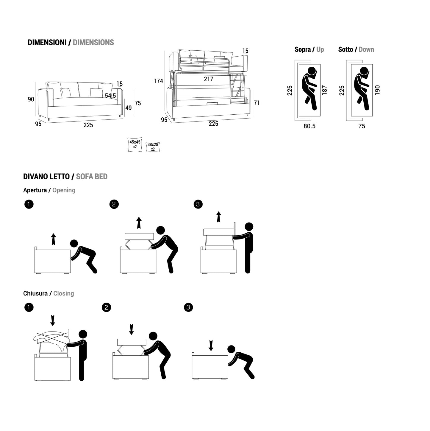 The compact outline of Ares conceals a user-friendly and space-saving soul. Within its smart design, Ares reveals two comfortable beds discreetly tucked between the backrest and armrests, showcasing its adaptability and welcoming nature. The transformation from a sofa to bunk beds is executed with unparalleled ease, making Ares a practical and stylish addition to any home.