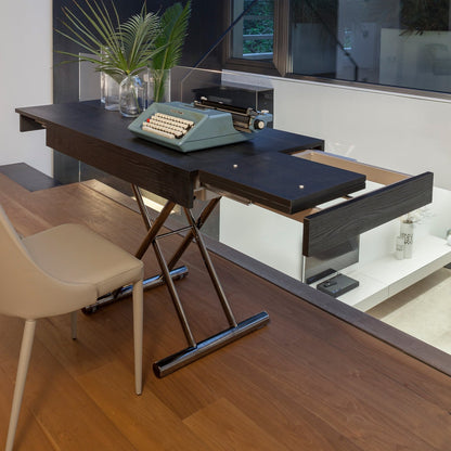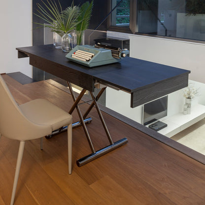 Adding to its convenience, retractable wheels ensure effortless mobility, allowing you to effortlessly shift and adapt your space to suit your evolving requirements. Embrace the fusion of form and functionality with this multifunctional piece that seamlessly transitions from a centrepiece coffee table to a dynamic home office workspace.