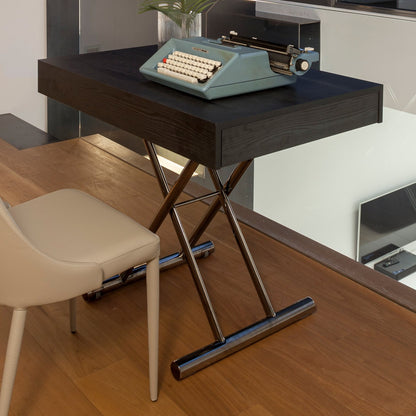 The rectangular top, available in various finishes such as melamine, wood, or a chic mortar effect, not only adds aesthetic appeal but also houses two internal folding extensions. This unique feature enables the expansion of the support surface, accommodating diverse functional needs while maximising available space.