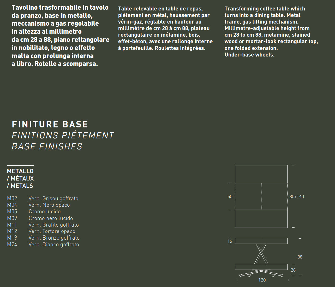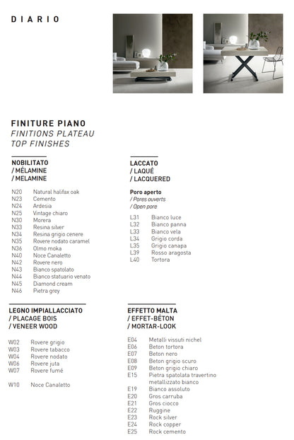 Its rectangular top, available in melamine, wood, or a stunning mortar effect, conceals an internal book extension, adding an element of surprise to its functionality. Convenience is key with retractable castors that effortlessly glide, offering mobility without compromising stability. Whether it's an intimate coffee gathering or a lively dining soirée, the Diario is your faithful companion, embodying adaptability, style, and convenience in a single piece of furniture.