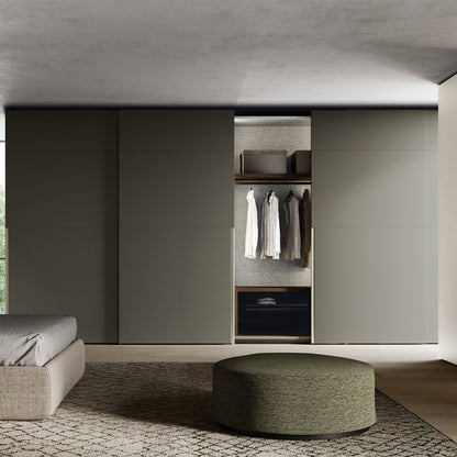 Green Door in Three PanelsThe Green door elevates its consistently unassuming simplicity to a stylistic characteristic. It can consist of three panels of varying dimensions that lend dynamism to its core essence, accentuated at will with the built-in handle. In the initial image, the wardrobe is presented in a matt lacquered grigio Aston with a handle finished in matt lacquered grigio perla. Similarly, the second image showcases a wardrobe in matt lacquered grigio perla, complemented by a handle in matt lacquered grigio Aston.