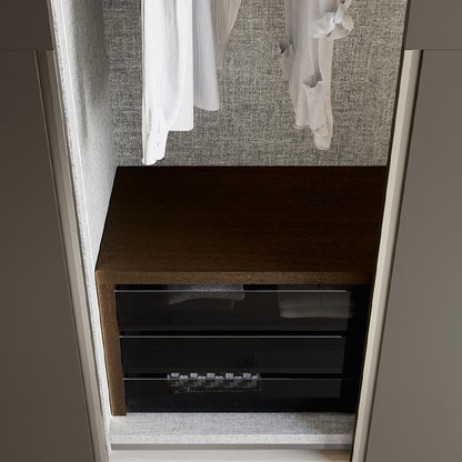 - Internal drawers available in various widths, matching the sizes of wardrobe units. These are stackable to create endless variations and come with fronts in wood or grey transparent glass framed finish. - Vertical built-in lamp with a movement reading sensor.