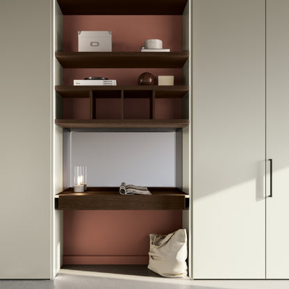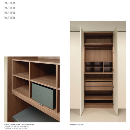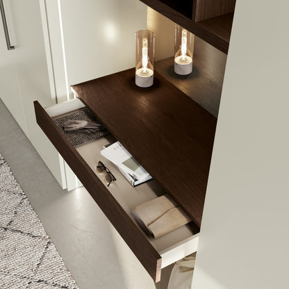 - Internal drawers available in various widths, matching the sizes of wardrobe units. These are stackable to create endless variations and come with fronts in wood or grey transparent glass framed finish. - Vertical built-in lamp with a movement reading sensor.