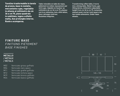 Effortlessly transforming from a chic coffee table to a spacious dining surface, Levante is a testament to adaptability. Featuring a sturdy metal base and a gas mechanism, its height adjusts seamlessly from 36 cm to 75 cm, ensuring precision to the millimeter. Its adjustable design easily accommodates different table heights with a simple shift, providing you with a seamless transition and the perfect gathering spot for any occasion.