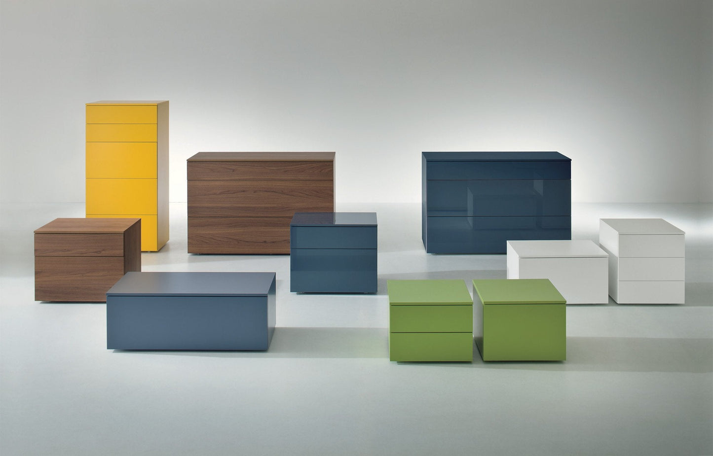- Drawers: Sides 14 mm th. and bottoms 8 mm th. made of wood particle-board panels with leather-effect melamine finish. Easy-slide concealed metal runners, 30 kg dynamic load capacity. Push-pull closing mechanism with height and depth adjustment system. A standard built-in stabilizer is provided for drawers with a width equal or larger than 90cm.