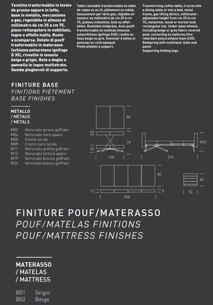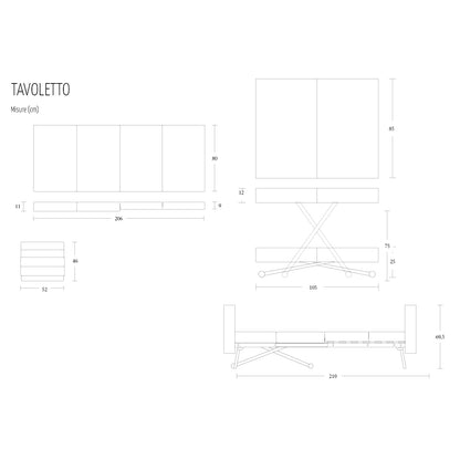 Included with this multifaceted gem is a fabric-covered pouffe that ingeniously transforms into a fire-retardant polyurethane foam mattress (D35), ensuring both comfort and safety. Its innovative bedspring incorporates multilayer slats and panels, supported by folding legs, guaranteeing stability and durability in its various configurations. Tavoletto isn't just furniture; it's an invitation to embrace functionality, style, and the allure of Italian design.