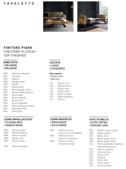 Designed with precision, Tavoletto features a sturdy metal frame and a gas lifting mechanism, enabling seamless height adjustments from 25 to 75 centimetres. The table boasts a choice of melamine, wood, or a stunning mortar-effect rectangular top, complemented by under-base wheels for easy mobility.